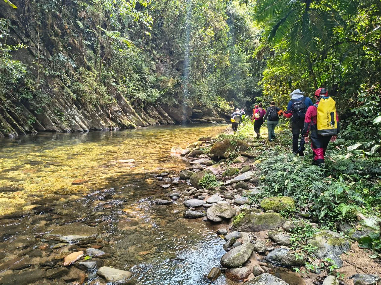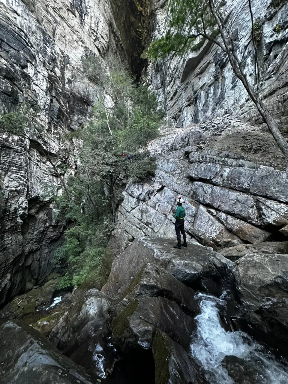 No primeiro dia, foram coletados dados e realizadas medições de vazão nos salões Santo Antônio, Ressurgência e Sifão, com acesso pela ressurgência do córrego Maximiano. No segundo dia, foram executadas a coleta de dados no pórtico da caverna, a medição de vazão do córrego e o mapeamento aéreo com drone, seguido do retorno à base.
